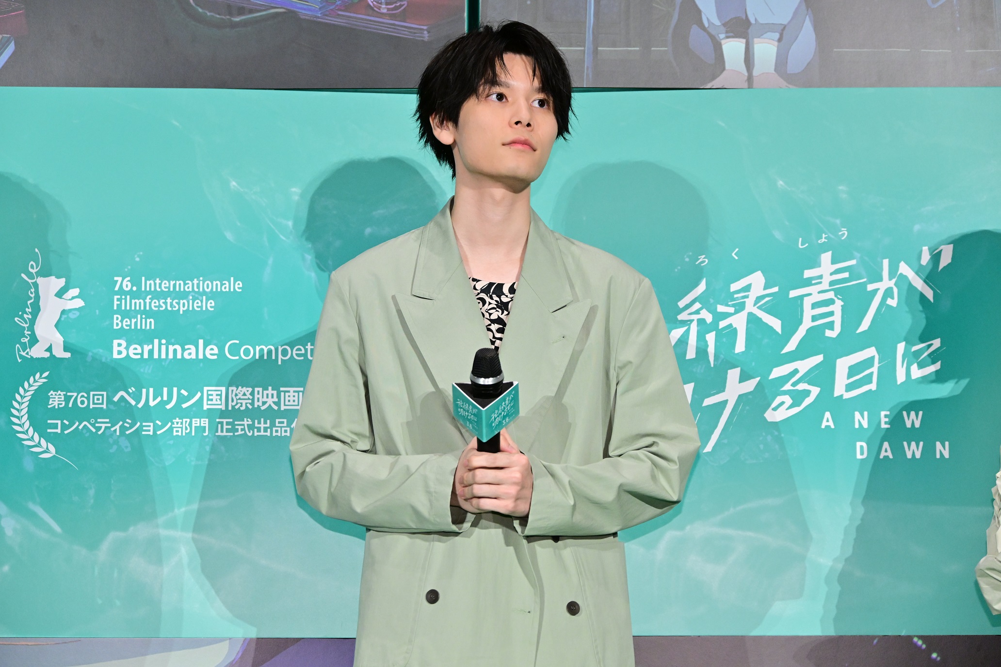 第76 回ベルリン国際映画祭コンペティション部門に正式出品し、現地時間2 月18 日にワールドプレミアを実施した『花緑青が明ける日に』(3 月6 日公開)が、日本でついにお披露目!2 月24 日に新宿バルト9 にてジャパンプレミアが実施され、声優を務めた萩原利久と古川琴音、そして四宮義俊監督が登壇した。 長編デビュー作でのベルリン国際映画祭コンペ部門入りは日本アニメ初の快挙!…ということで、第76 回ベルリン国際映画祭コンペティション部門正式出品を祝すべく、『花緑青が明ける日に』のイラストがデコレーションされたケーキで祝福した。